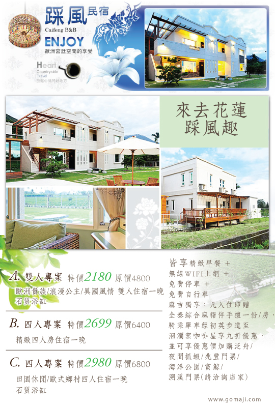 只要2180元起,即可享有【花蓮-踩風民宿】春季旅遊踩風花蓮住宿專案A.雙人/BC.四人專案〈含A.(歐洲貴族/浪漫公主/異國風情雙人)/B.精緻四人房/C.(田園休閒/歐式鄉村四人房) 住宿一晚 + 精緻早餐 + 無線WIFI上網 + 免費停車 + 免費自行車,AC方案另含石質浴缸〉麻吉獨享:凡入住即贈全泰綜合麻糬伴手禮一份/房,騎乘單車經初英步道至洄瀾窯咖啡屋享九折優惠,並可享優惠價加購泛舟/夜間抓蝦/兆豐門票/海洋公園/賞鯨/溯溪門票(請洽詢店家)